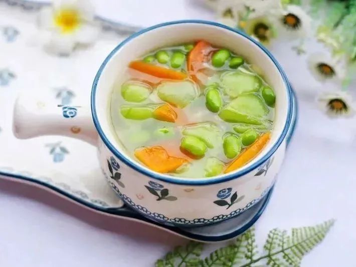 丝瓜1根、毛豆50g、胡萝卜半根、姜1块、盐、食用油适量