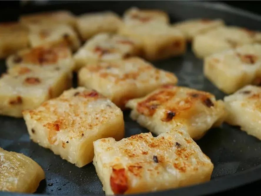 8、平底锅里刷一层薄油,翻入切片的萝卜糕,煎到两面焦脆即可