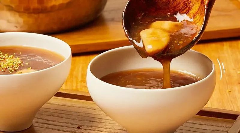 6、待芋头软糯变红色时,调小火,将藕粉慢慢倒入锅中,边倒边搅拌均匀