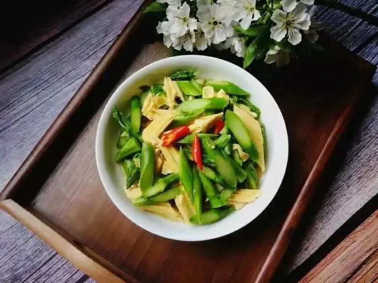 芦笋、腐竹、小米椒、姜末 玉米油、酱油、盐