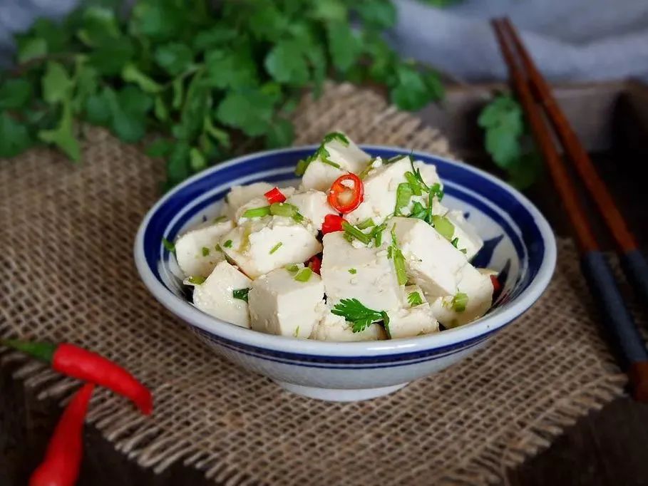 豆腐1块、小米椒2根、香菜3根、盐1茶匙、生抽1勺、香油1茶匙